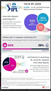 दर्शकों के आईपीएल देखने के पैटर्न में भी दिलचस्प बदलाव हुए हैं। रिपोर्ट के मुताबिक 52% लोग टीवी और मोबाइल दोनों पर आईपीएल देखना पसंद करते हैं। 30% दर्शक ऐसे हैं जो केवल मोबाइल पर आईपीएल देखते हैं और केवल 18% अभी भी टीवी से चिपके हैं। आंकड़ों पर नजर डालें तो साफ है कि एक तिहाई दर्शक जियो-सिनेमा से सीधे जुड़े हैं। जबकि 50 फीसदी से अधिक दर्शक मोबाइल और टीवी दोनों का इस्तेमाल कर रहे हैं।