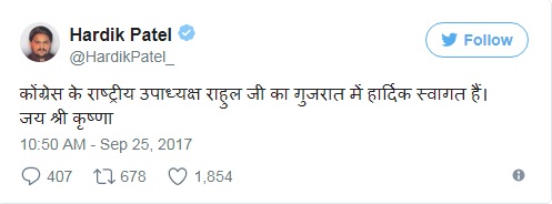 कांग्रेस के उपाध्यक्ष राहुल गांधी तीन दिवसीय गुजरात दौरे पर हैं। उन्होंने द्वारकाधीश मंदिर में पहुंचकर पूजा की। वह सौराष्ट्र के 5 जिलों में रोड शो भी करेंगे। गुजरात चुनाव से पहले कांग्रेस उपाध्यक्ष धुआंधार प्रचार में जुट गए हैं। इस बीच जब राहुल गुजरात पहुंचे तो पाटीदार समुदाय के नेता हार्दिक पटेल ने ट्वीट कर उनका स्वागत किया। अब तक आम आदमी पार्टी के साथ दिखते रहे हार्दिक के इस ट्वीट ने नई अटकलों को जन्म दे दिया है।