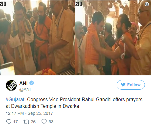 कांग्रेस के वरिष्ठ नेता शक्ति सिंह गोहिल ने बताया कि मंदिर में पूजा करने के बाद राहुल गुजरात में पार्टी के चुनाव प्रचार के तहत सड़क मार्ग से सौराष्ट्र क्षेत्र का दौरा करेंगे। गोहिल ने कहा, ‘राहुल गांधी विभिन्न स्थानों पर लोगों को संबोधित करेंगे और रास्ते में उनसे बातचीत करेंगे।’ गोहिल ने बताया कि पार्टी उपाध्यक्ष इसके बाद जामनगर शहर जाएंगे जहां वह रात्रि विश्राम करेंगे।