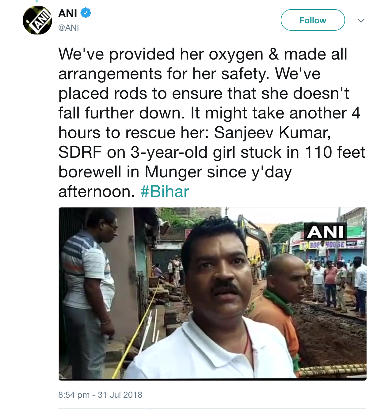 3-year-old girl fell in a 110 feet bore well in Munger. Rescue operations underway. #Bihar pic.twitter.com/m0YIpmqwiS