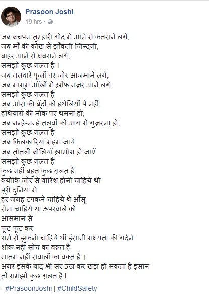 गुरुग्राम में एक जाने-माने स्कूल में एक बच्चे की हत्या ने हर किसी को झिंझोड़कर रख दिया है. फिल्मों से जुड़े लोग भी इस घटना के बाद बहुत सहम गए हैं. हाल ही में सेंसर बोर्ड के अध्यक्ष बने गीतकार प्रसून जोशी ने इस मुद्दे पर एक कविता लिखकर फेसबुक पेज पर शेयर की.