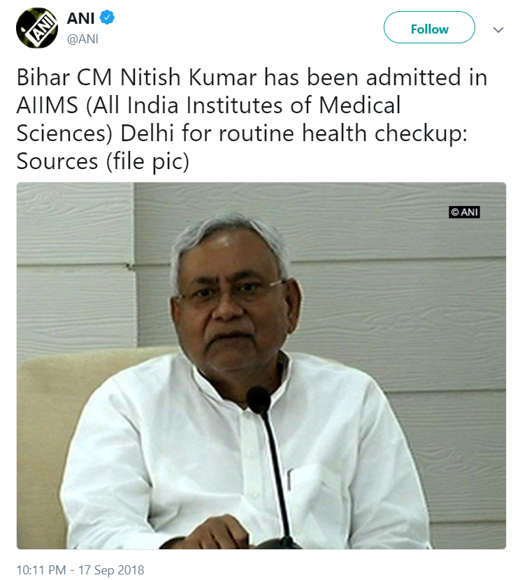 बिहार के मुख्यमंत्री और जनता दल यूनाइटेड (जदयू) के अध्यक्ष नीतीश कुमार इन दिनों बीमार चल रहे हैं। सीएम नीतीश कुमार मंगलवार को इलाज कराने के लिए दिल्ली स्थित ऑल इंडिया इंस्टीट्यूट ऑफ मेडिकल साइंसेज (एम्स) में रूटीन हेल्थ चेकअप के लिए भर्ती हुए हैं।