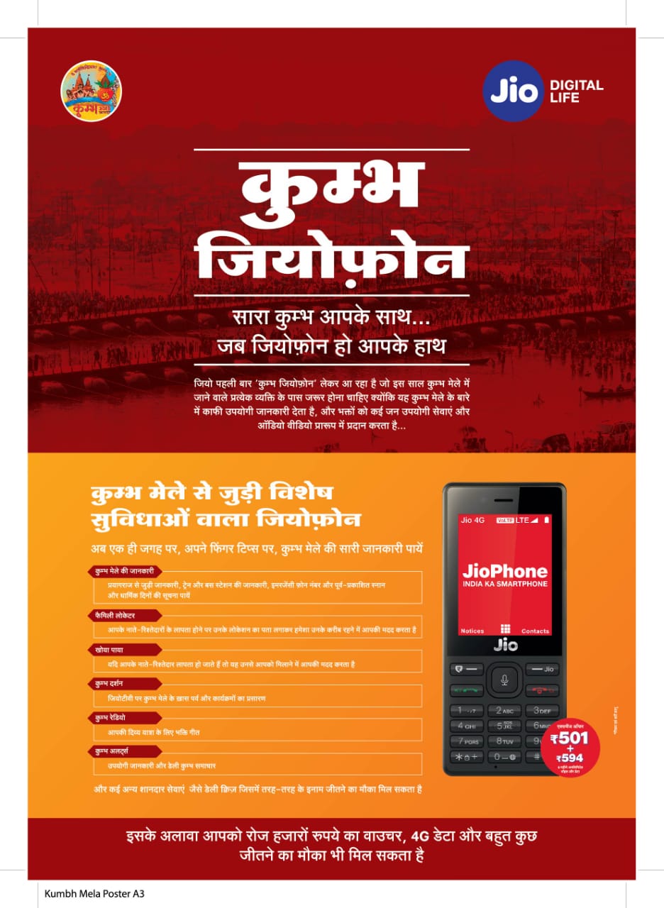 प्रयागराज के कुम्भ मेले में भारी संख्य में आने वाले श्रद्धालुओं के लिय जियो ने नए ‘कुम्भ जियोफोन’ की पेशकश की है। ‘कुम्भ जियोफोन’ कुम्भ मेले से जुड़ी हर छोटी बड़ी जानकारी से लैस है। ट्रेन और बस स्टेशन की सूचनाओं के साथ साथ किस दिन कौन सा स्नान है इस की जानकारी भी ‘कुम्भ जियोफोन’ से प्राप्त की जा सकती है।