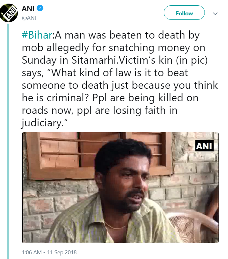 पीड़ित के परिवर वालों ने कहा कि यह कैसे कानून है कि किसी एक व्यक्ति को पीट पीट कर मार दिया जाता है क्योंकि आप सोचते हैं कि वो कोई अपराधी है। लोग सड़कों पर अब मार रहे हैं। जिसके चलते लोगों को न्यायपालिका से विश्वास उठता जा रहा है। मामला उस वक्त का है कि जब उनका भतीजा सामान खरीदने अपने दोस्त के साथ सीतामढ़ी जा रहा था कि रास्ते में पिकअप वाले से साइड को लेकर विवाद शुरु हो गया। जिसके बाद भीड़ ने युवक को पकड़ लिया। जिसके बाद उसे मारना पिटना शुरू कर दिया। इस दौरान उसकी मौत हो गई।