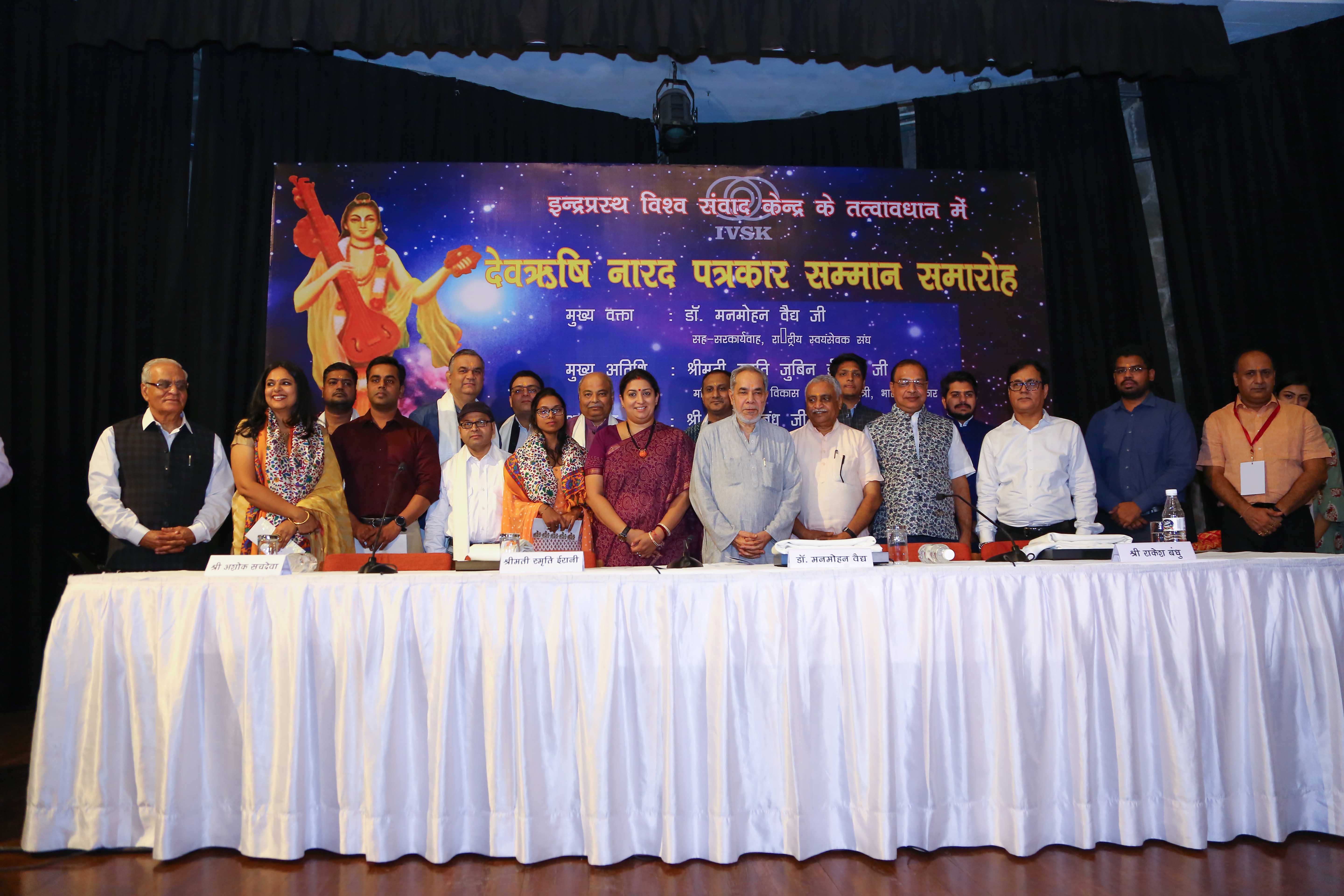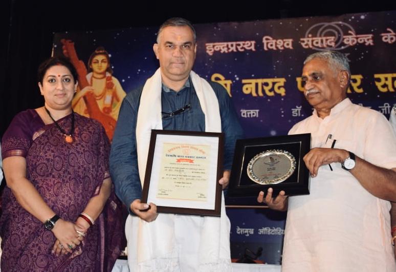 नई दिल्ली, 29 जून। पत्रकारिता के क्षेत्र में उल्लेखनीय योगदान के लिए नई दिल्ली के इंडिया इंटरनेशनल सेंटर में आज पत्रकारों को देवऋषि नारद पत्रकार सम्मान पुरस्कार प्रदान किए गए। इन्द्रप्रस्थ विश्व संवाद केंद्र के तत्वावधान में आयोजित हुए देवऋषि नारद पत्रकार सम्मान समारोह-2019 में राष्ट्रीय स्वयंसेवक संघ के सह-सरकार्यवाह डॉ. मनमोहन वैद्य के साथ महिला एवं बाल विकास तथा वस्त्र मंत्री श्रीमती स्मृति ईरानी के हाथों वरिष्ठ पत्रकार श्री रामबहादुर राय को आजीवन सेवा नारद पुरस्कार तथा  बिजनेस टीवी इंडिया के संपादक श्री सिद्धार्थ जराबी को समग्र उत्कृष्ट नारद सम्मान से अलंकृत किया। इसी कड़ी में इंडिया टुडे मैगजीन के डिप्टी एडिटर श्री उदय माहूरकर को प्रिंट पत्रकार नारद सम्मान, स्वतंत्र पत्रकार श्री नलिन चौहान को उत्कृष्ट स्तम्भकार नारद सम्मान, फर्स्ट पोस्ट के मुख्य संवाददाता श्री देवव्रत घोष को डिजिटल पत्रकारिता नारद सम्मान, इंडिया टीवी डिप्टी एडिटर व वरिष्ठ एंकर श्री सुशांत सिन्हा टी.वी पत्रकारिता नारद सम्मान, क्लीन द नेशन टीम को सोशल मीडिया नारद सम्मान, पांचजन्य के संवाददाता श्री अरुण कुमार सिंह को ग्रामीण पत्रकारिता नारद सम्मान, ऋचा अनिरुद्ध को स्त्री सरोकार-महिला संवेदना पत्रकारिता नारद सम्मान, श्री गणेश कृष्णन को युवा पत्रकार नारद सम्मान तथा  दंतेवाड़ा में नक्सली हमले में शहीद हुए दूरदर्शन के छाया चित्रकार स्व. अच्युतानंद साहू को मरणोपरांत उत्कृष्ट छायाचित्रकार नारद सम्मान से सम्मानित किया गया।
