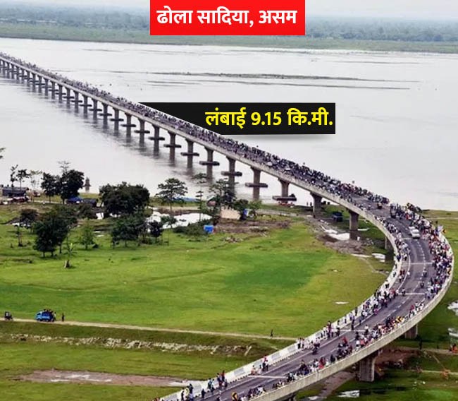 असम में ब्रह्मपुत्र नदी पर बना ढोला सादिया पुल देश का सबसे लंबा पुल माना जाता है। इसकी लंबाई करीब 9.15 किलोमीटर है। ये असम को अरुणाचल प्रदेश से जोड़ता है। मई 2017 में प्रधानमंत्री नरेंद्र मोदी ने इस पुल का उद्घाटन किया था।