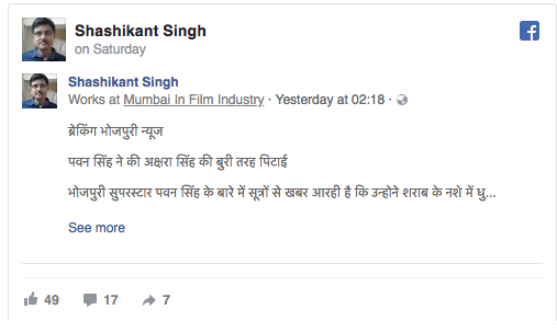 भोजपुरी इंडस्ट्री के लोकप्रिय एक्टर पवन सिंह और एक्ट्रेस अक्षरा सिंह को लेकर एक चौंका देने वाली खबर सामने आई है. एनडीटीवी पर छपी एक रिपोर्ट के मुताबिक, नशे में धुत पवन सिंह ने अपनी को-एक्ट्रेस अक्षरा सिंह की पिटाई कर दी है. इस बात की खबर पत्रकार और भोजपुरी फिल्मों के पीआर शशिकांत सिंह ने अपने फेसबुक अकाउंट के जरिए लोगों के बीच शेयर की है.