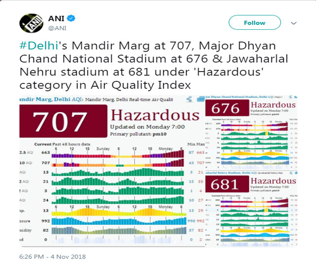 सोमवार सुबह दिल्ली के मंदिर मार्ग इलाके का एयर क्वॉलिटी इंडेक्स 707 दर्ज किया गया, मेजर ध्यान चंद स्टेडियम में हवा की गुणवत्ता 676 रही और जवाहर लाल नेहरू स्टेडियम की 681। एयर क्वॉलिटी के ये स्तर ‘खतरनाक’ की कैटिगरी में आते हैं।