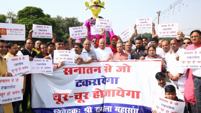 लाल किला ग्राउंड में आयोजित इस शांतिपूर्ण प्रर्दशन बैठक में सभी लीलाओं से आए पदाधिकारी सनातन के खिलाफ लगातार जहर उगल रही ताकतों के बयानों से बेहद अपसेट नजर आए, यहीं वजह रही कि बैठक में महासंघ के सभी प्रतिनिधियो ने सनातन विरोधी इन ताकतों पर तुरंत कार्यवाही करने की मांग करते रहे।