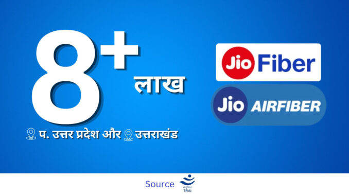 भारतीय दूरसंचार विनियामक प्राधिकरण (ट्राई) द्वारा जारी हालिया डेटा के अनुसार उत्तर प्रदेश पश्चिम सेवा क्षेत्र में 8 लाख 25 हजार घर जियो फाइबर और जियो एयर फाइबर से जुड़े हुए हैं। इस उपलब्धि को पाने वाला रिलायंस जियो उत्तर प्रदेश पश्चिम सेवा क्षेत्र में पहला टेलीकॉम ऑपरेटर बन गया है, जिसने कुल वायरलाइन ग्राहकों की 69% बाजार हिस्सेदारी हासिल कर ली है।