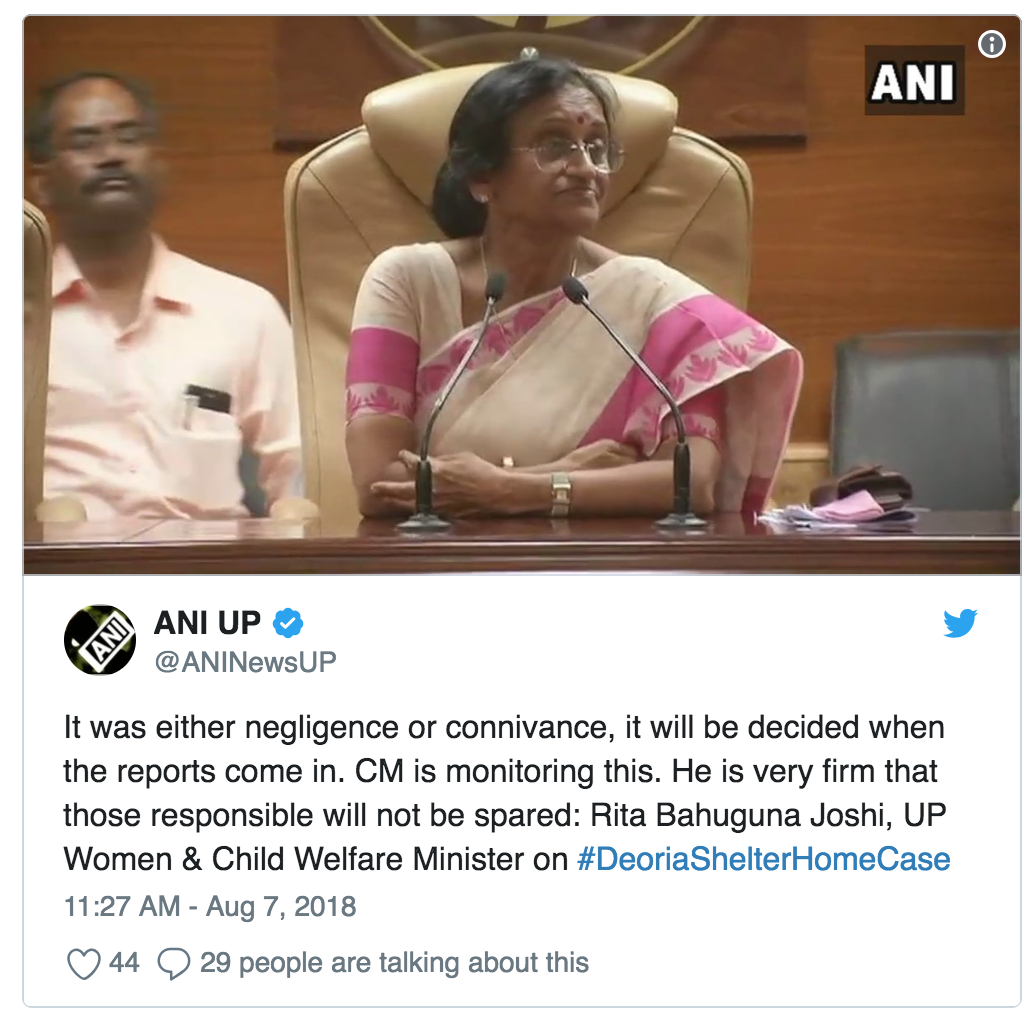 बिहार के मुजफ्फरपुर शेल्टर होम रेप केस के बाद अब उत्तर प्रदेश के देवरिया में शेल्टर होम पर राजनीति गरमाती जा रही है। यूपी की महिला एवं बाल विकास मंत्री रीता बहुगुणा जोशी ने इस पर बयान दिया है।